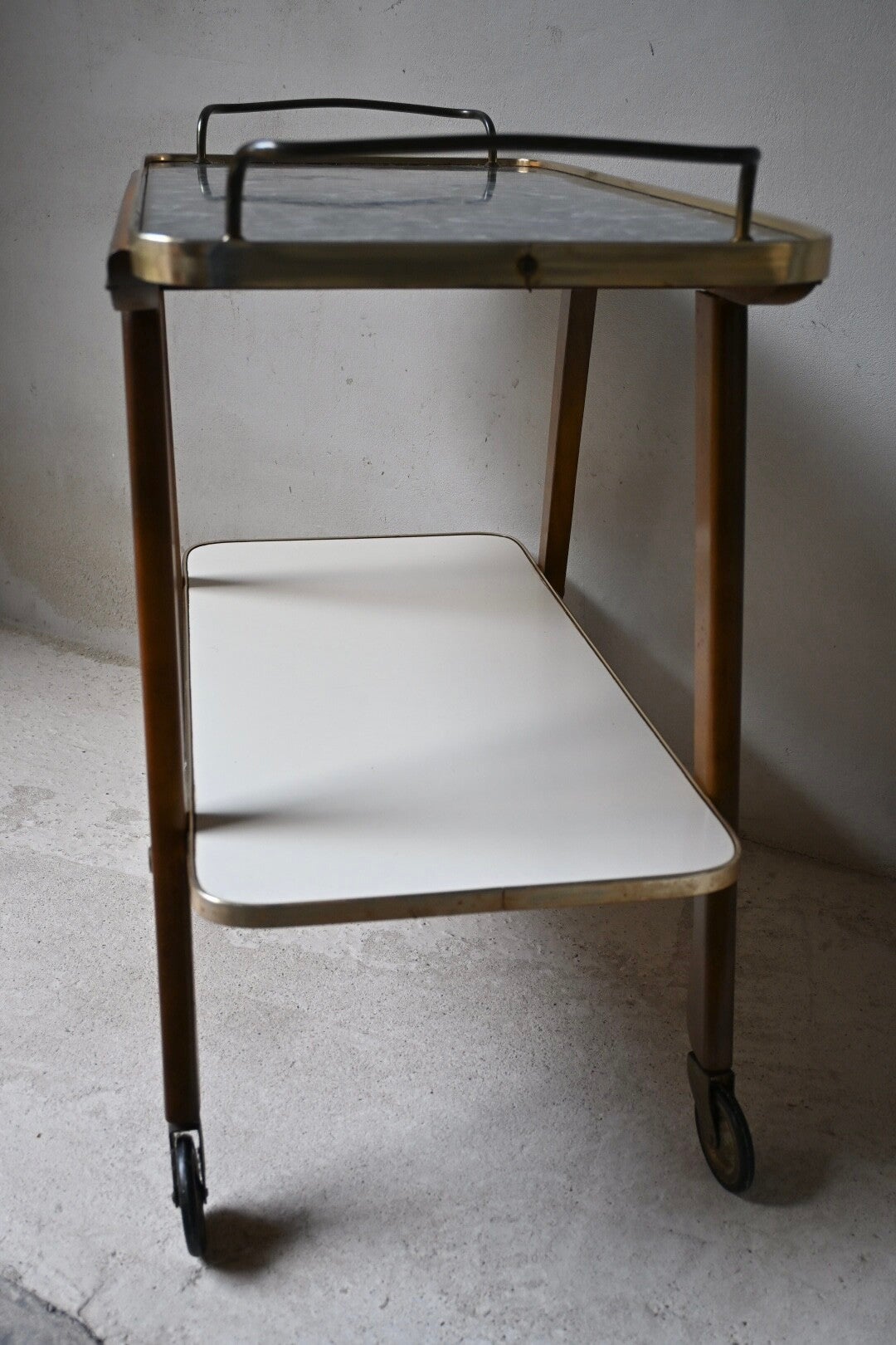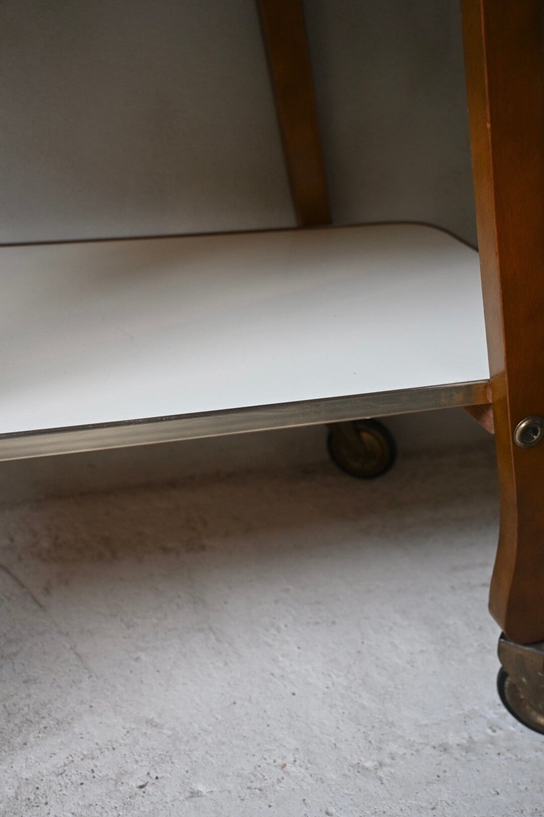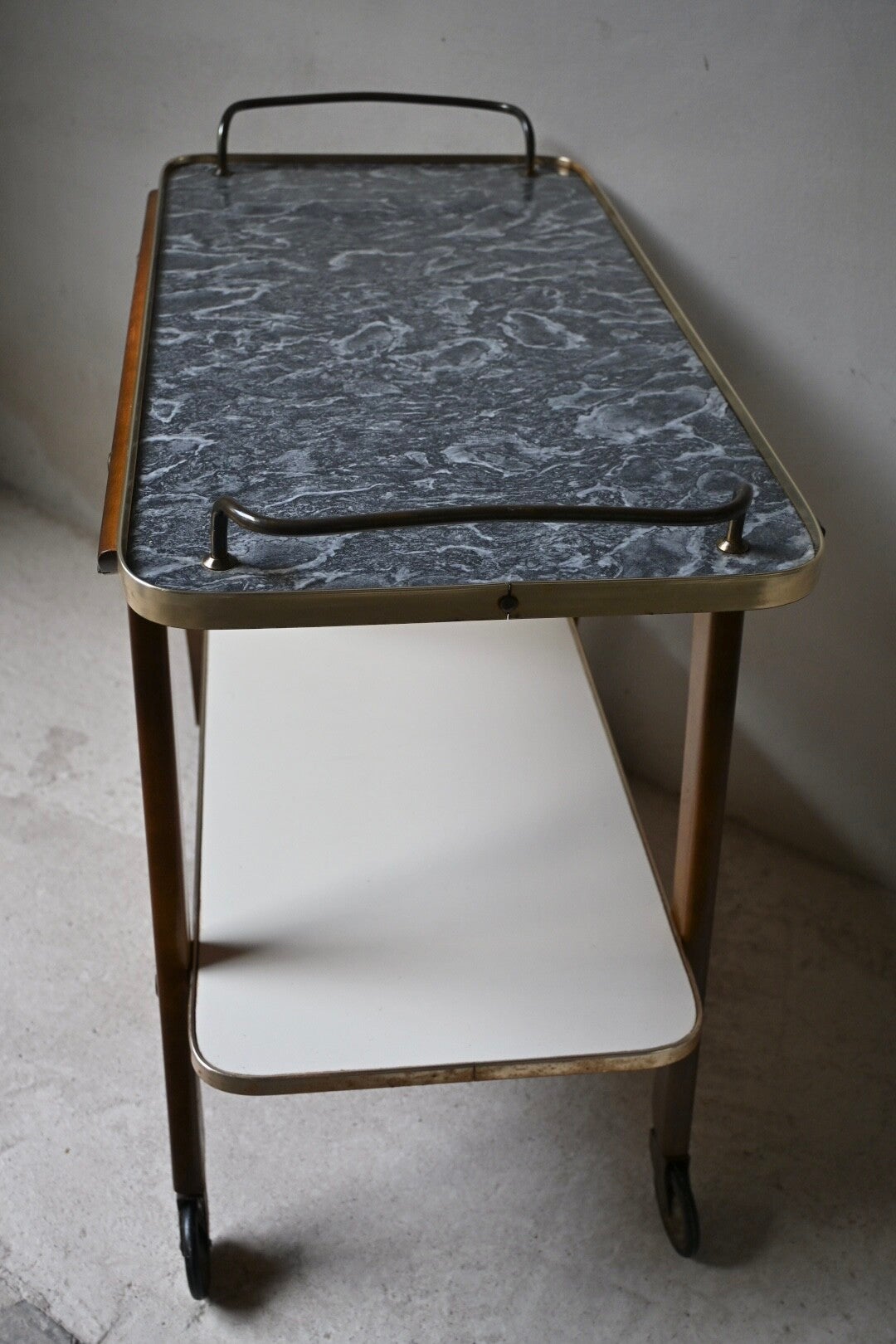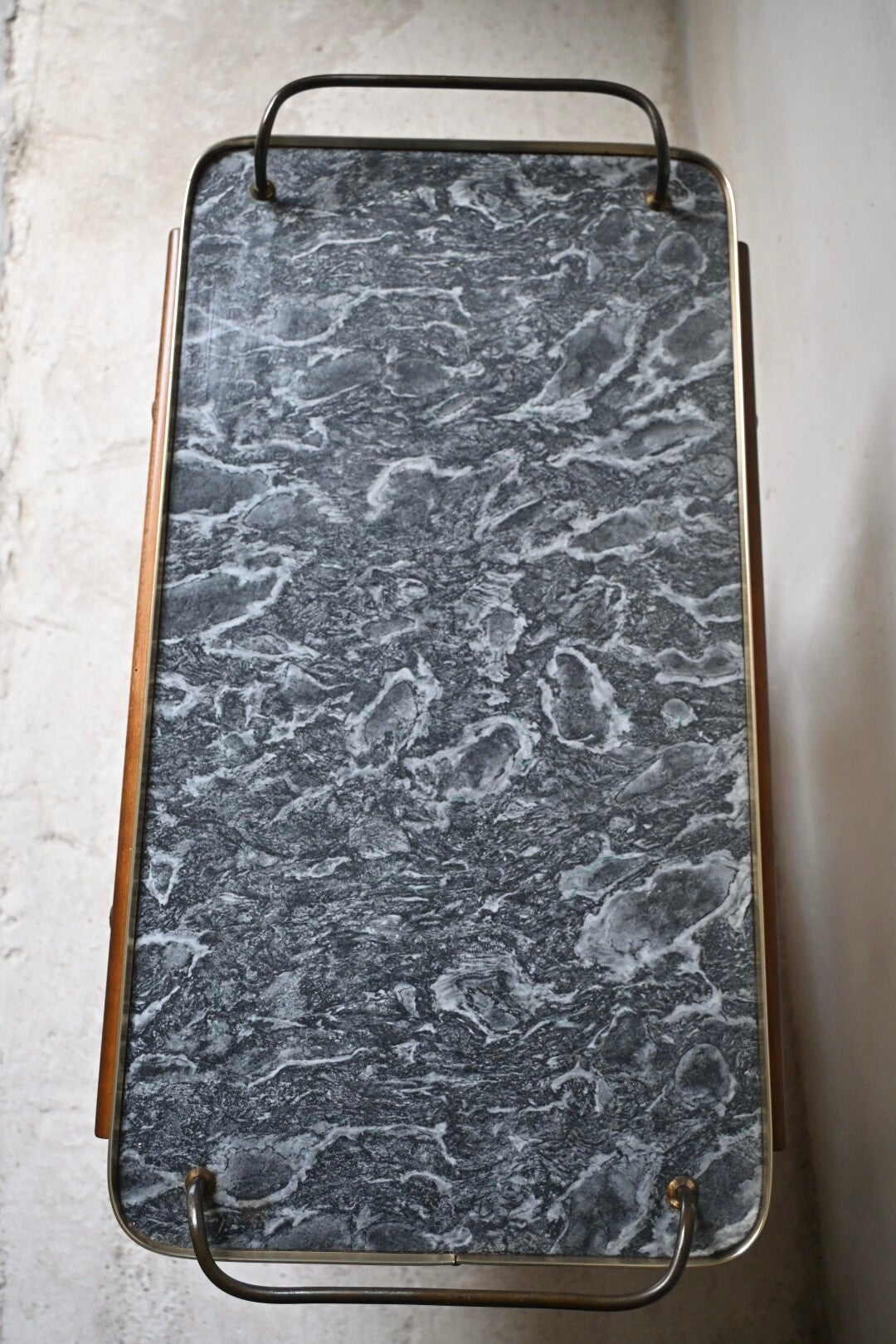Vintage Mid-century barcart houten frame met formica bladen.Mooi krachtig ontwerp wat een warme sfeer geeft.