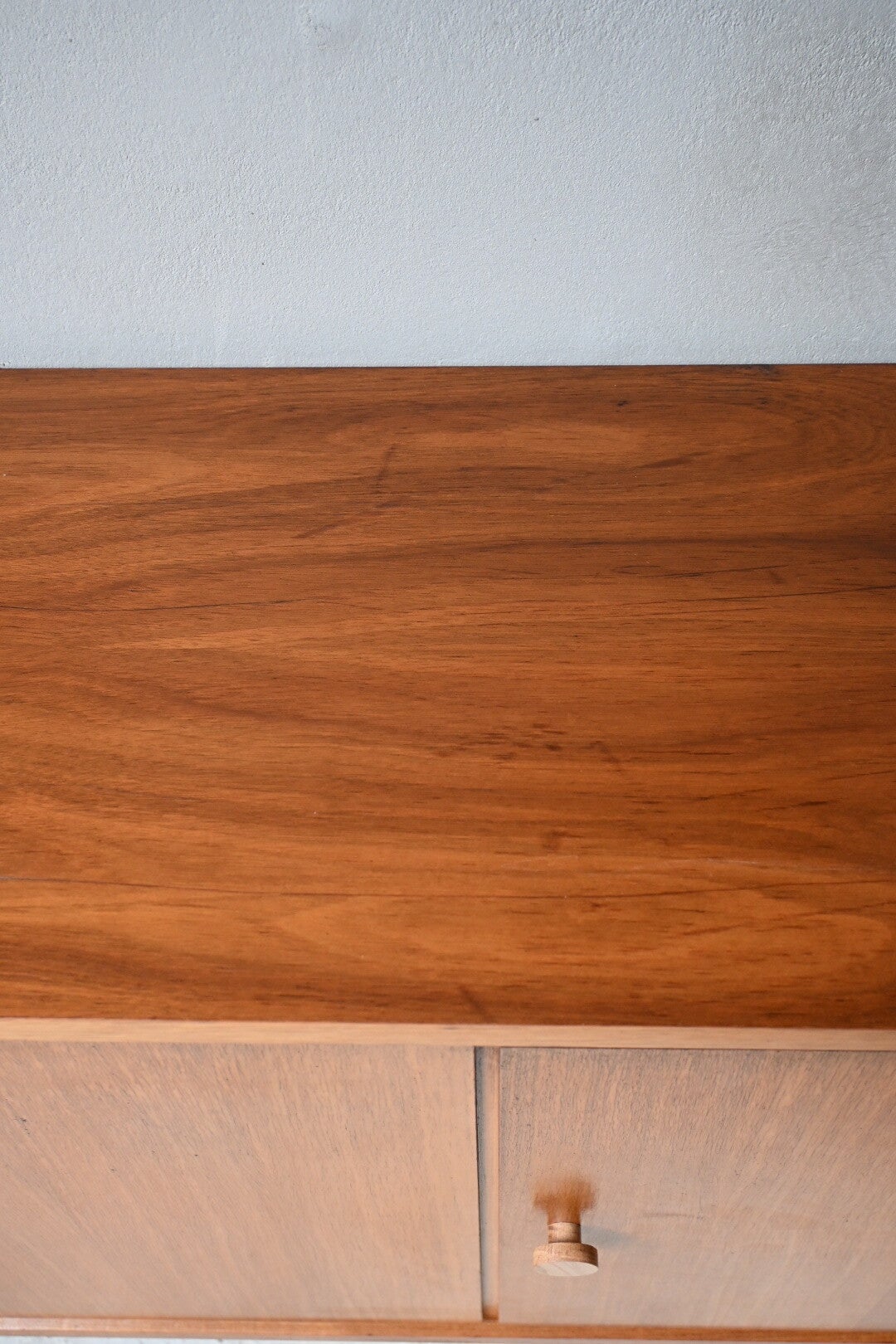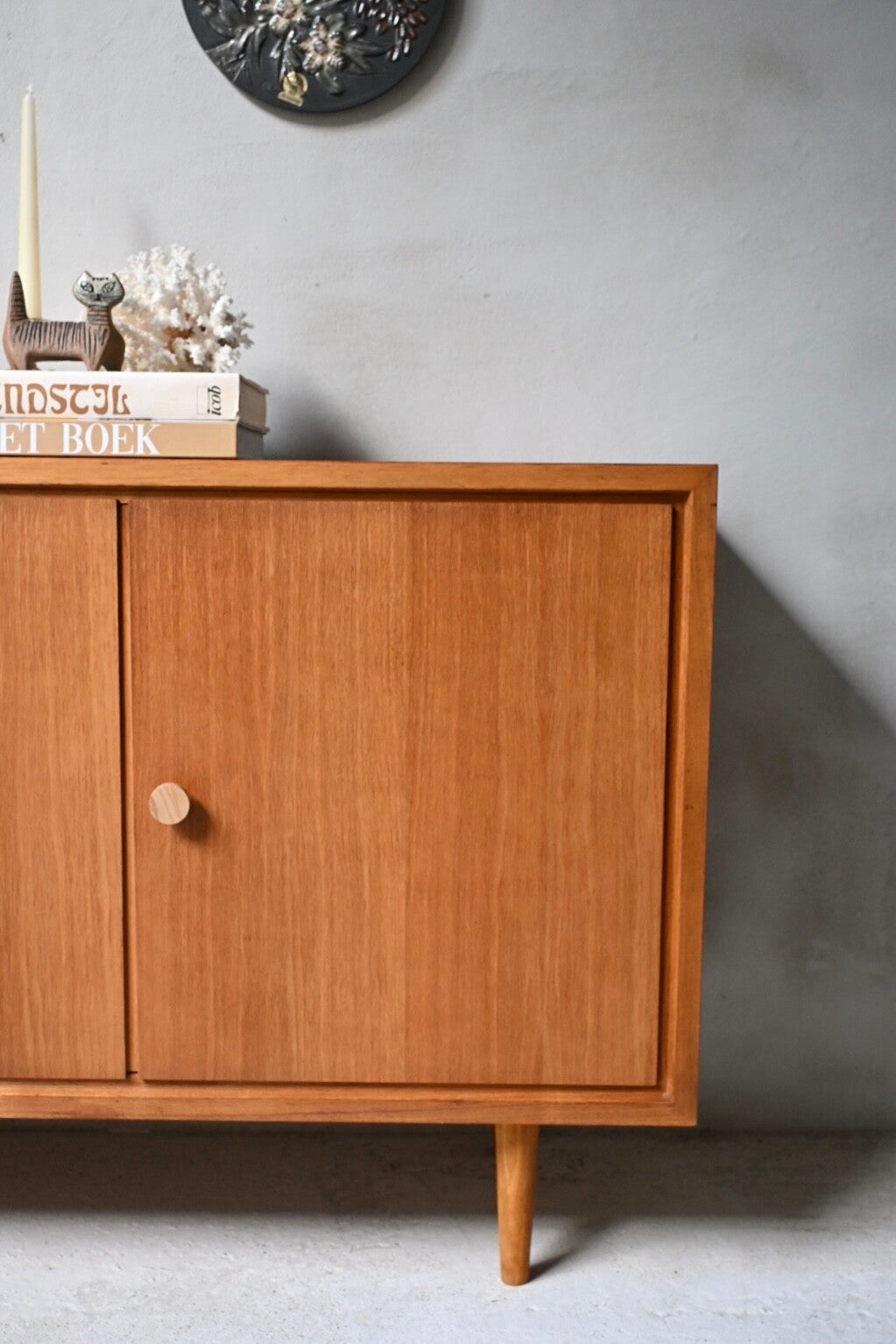 Het meubel is gemaakt van teakfineer.
