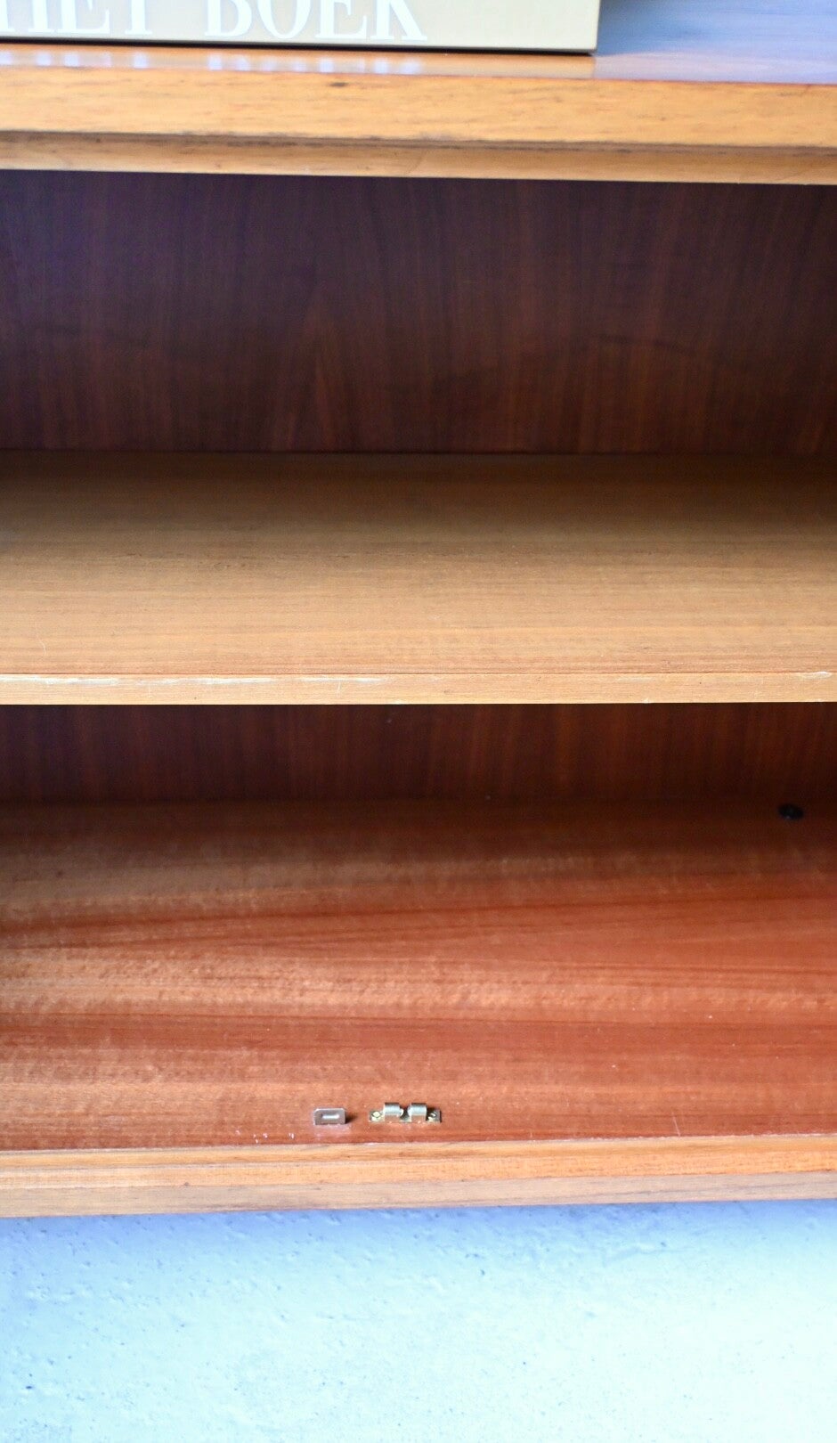 Achter de deurtjes een grote bergruimte opgedeeld door een legplank.
