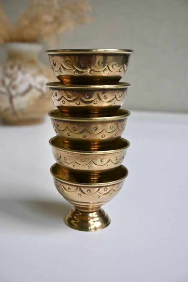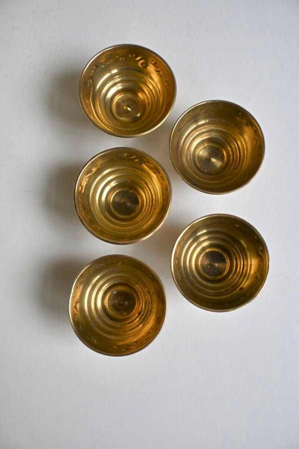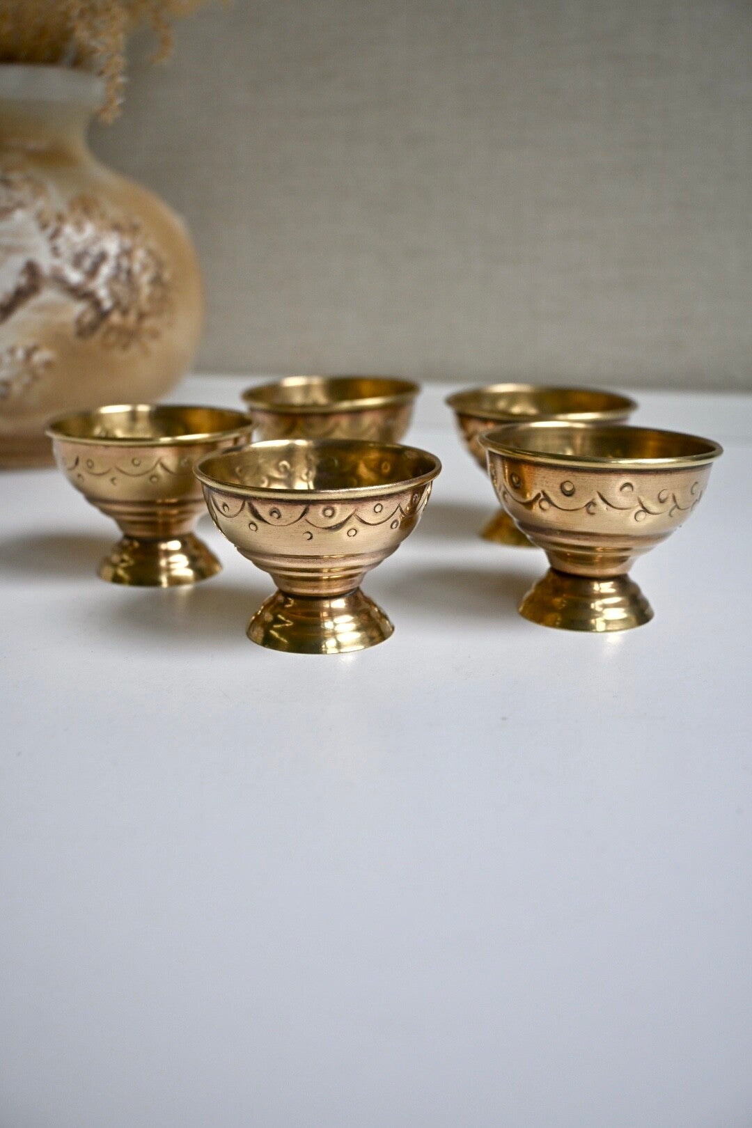 Mooie set van 5 messing eierdopjes, verkeren nog in een hele goede staat.