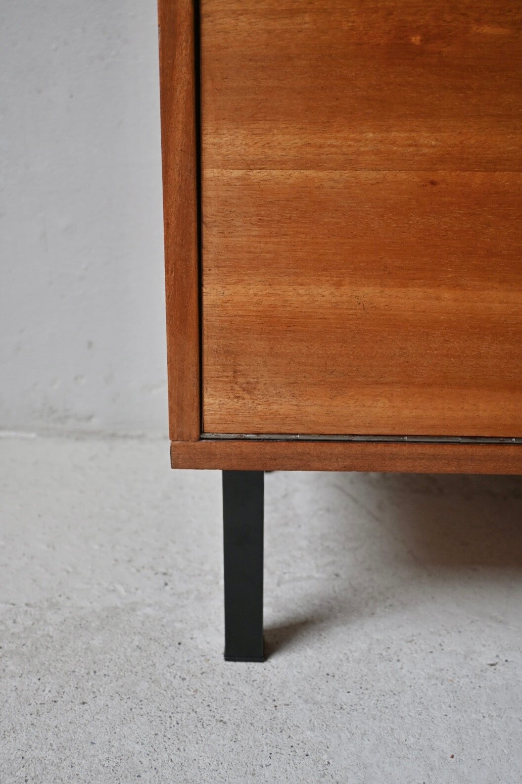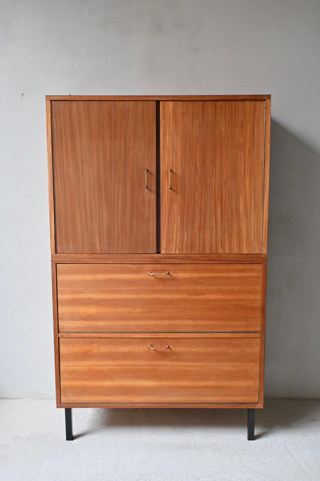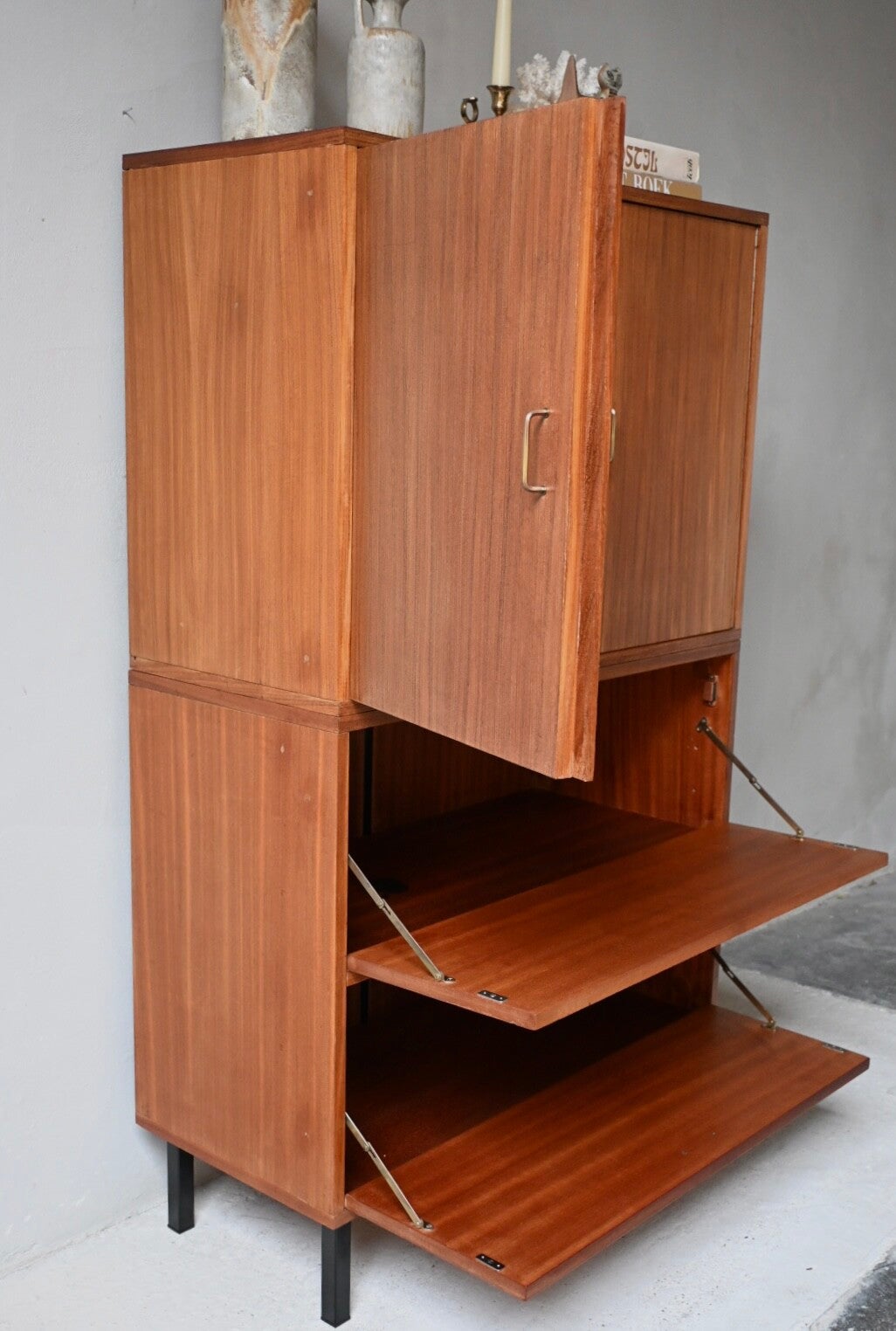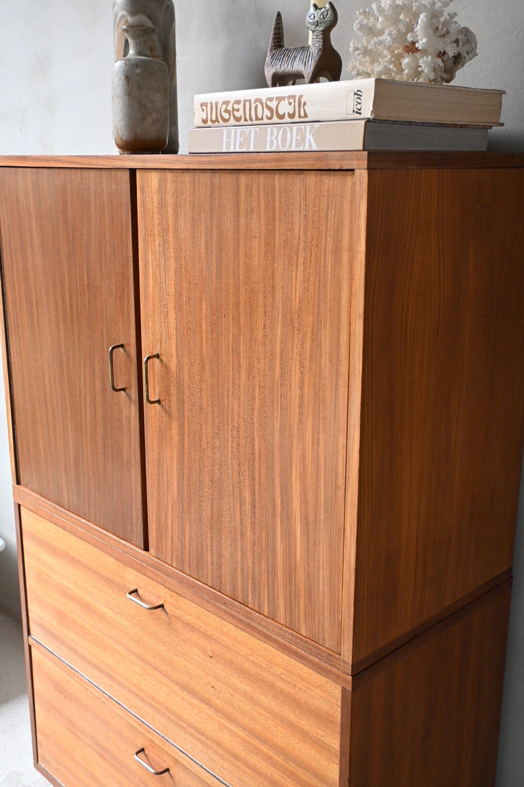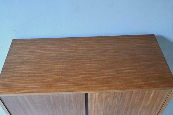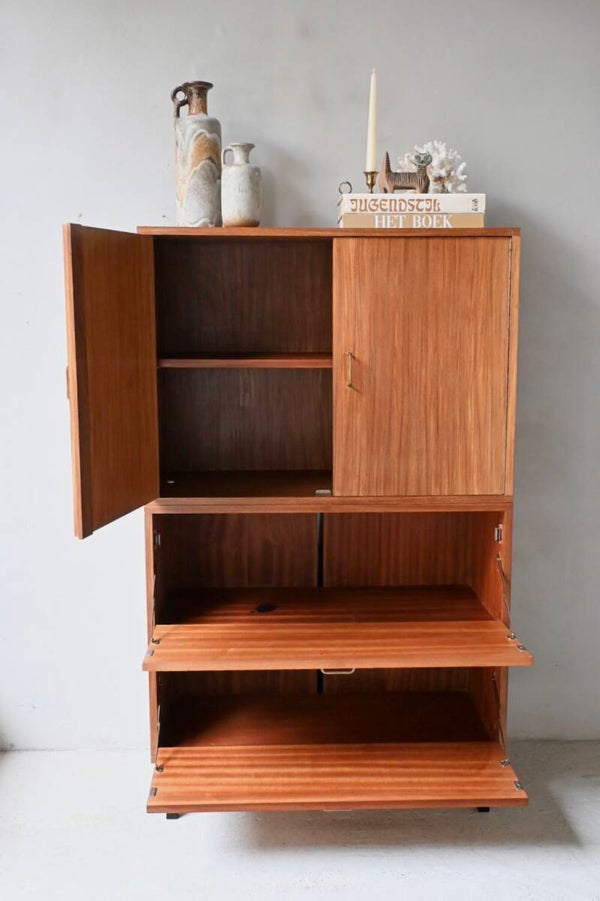 Dit meubel is gemaakt van teak-fineer en combineert stijl met functionaliteit.