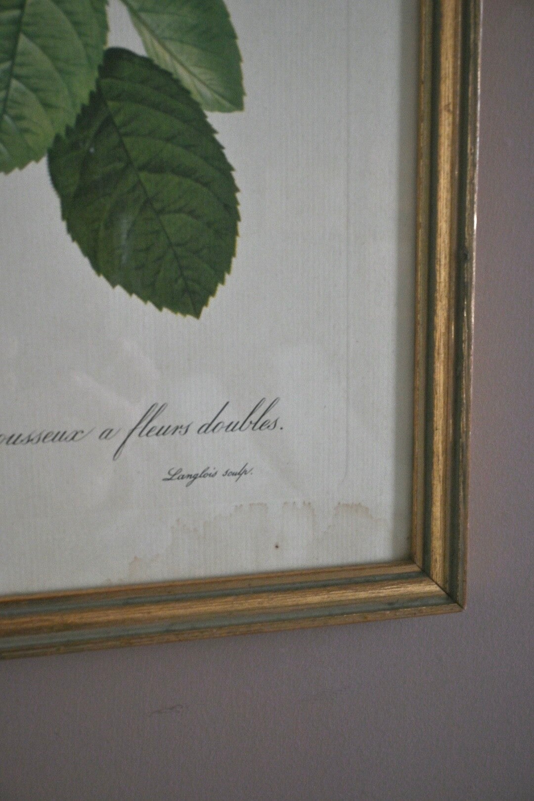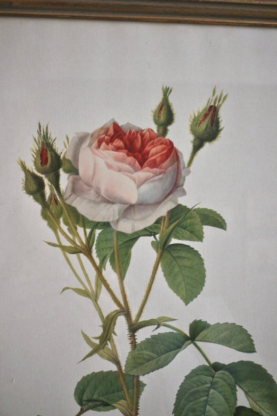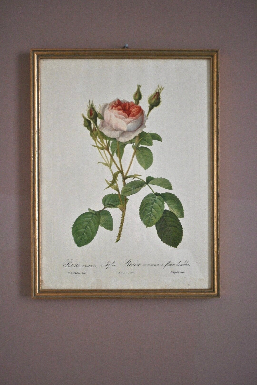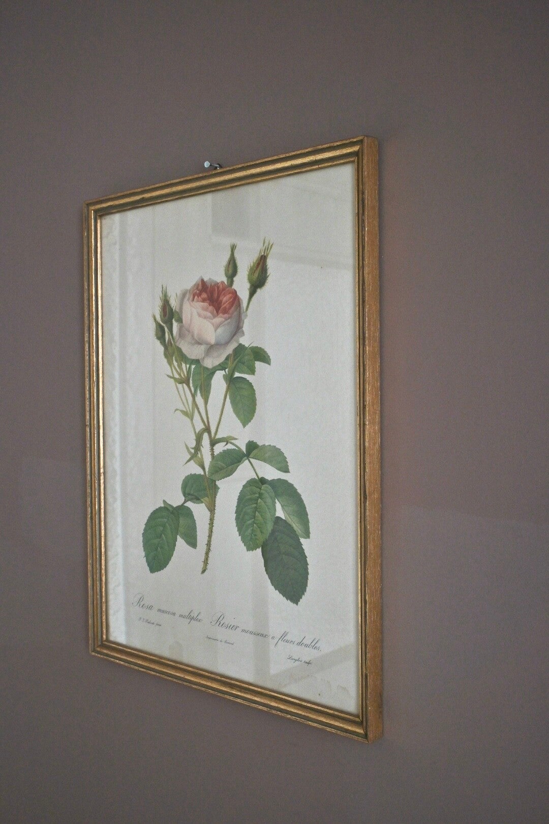 Mooie goudkleurige houten lijst met een prent van een roos, getiteld ‘Rosa muscosa multiplex' De prent is een reproductie van een werk van de beroemde botanische illustrator Pierre-Joseph Redouté.