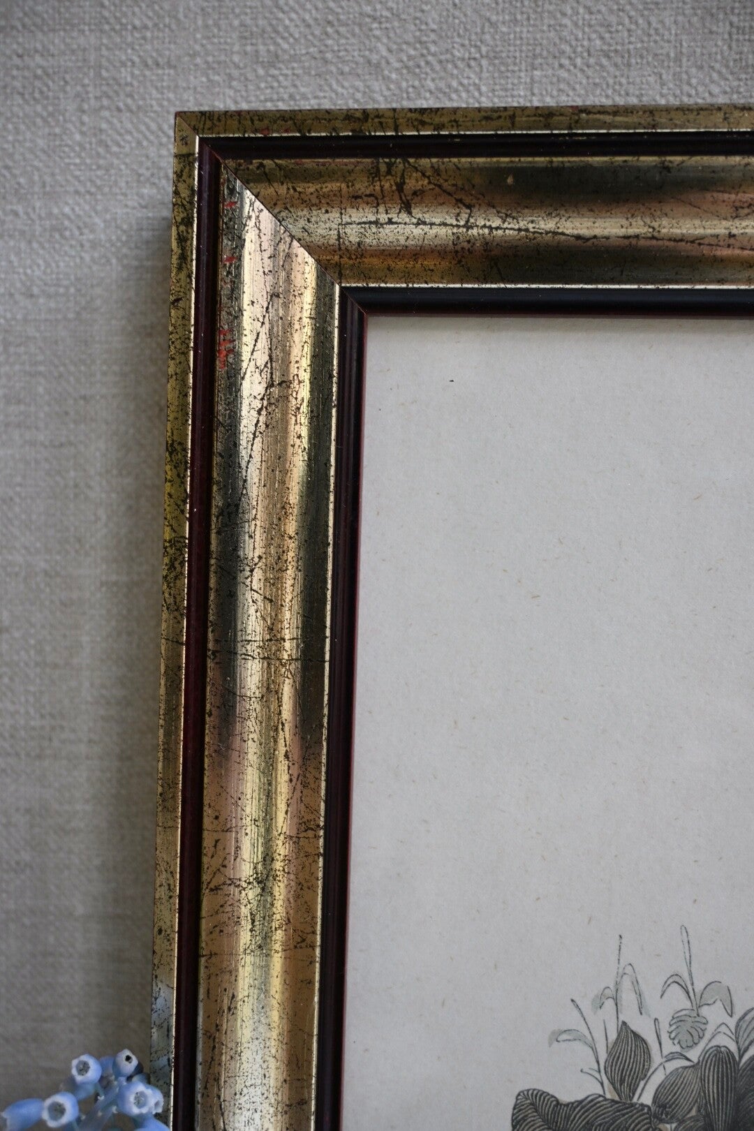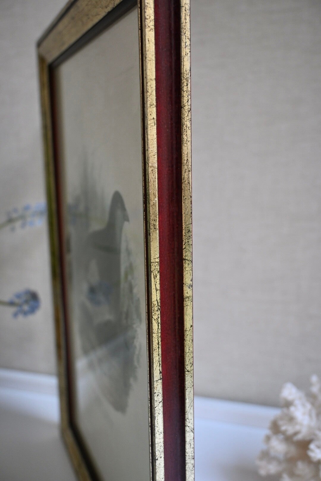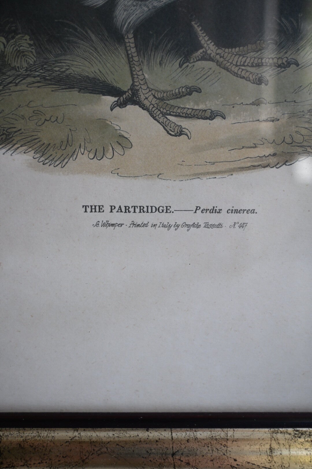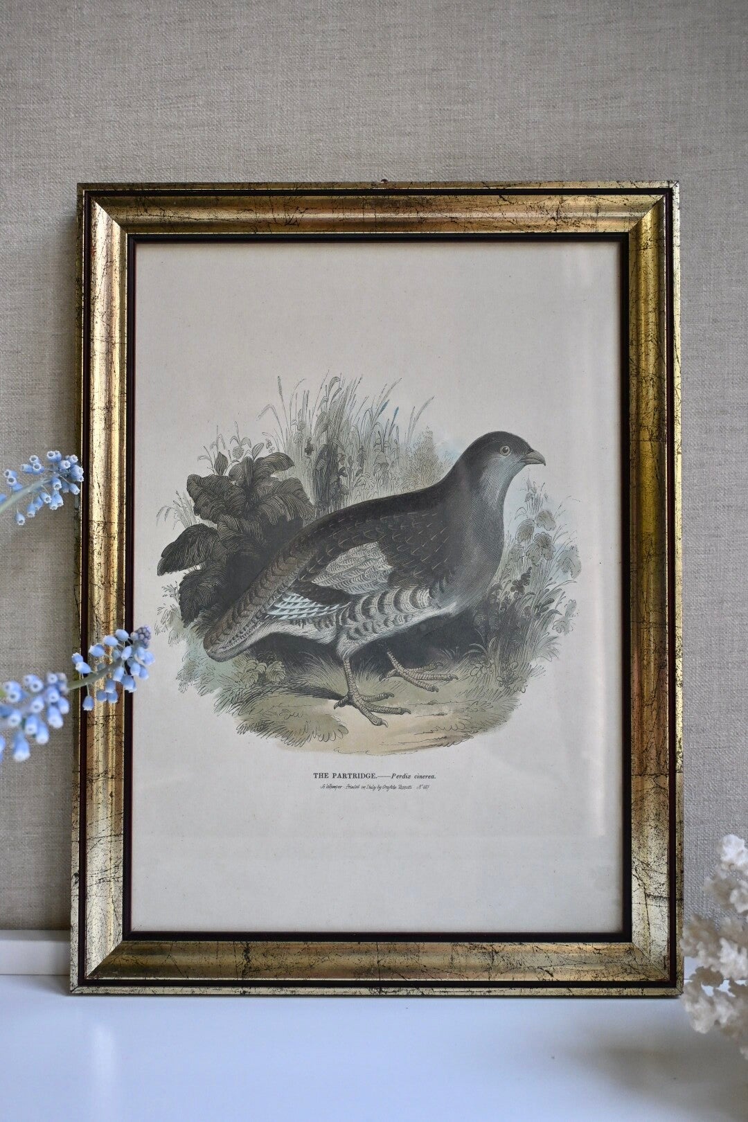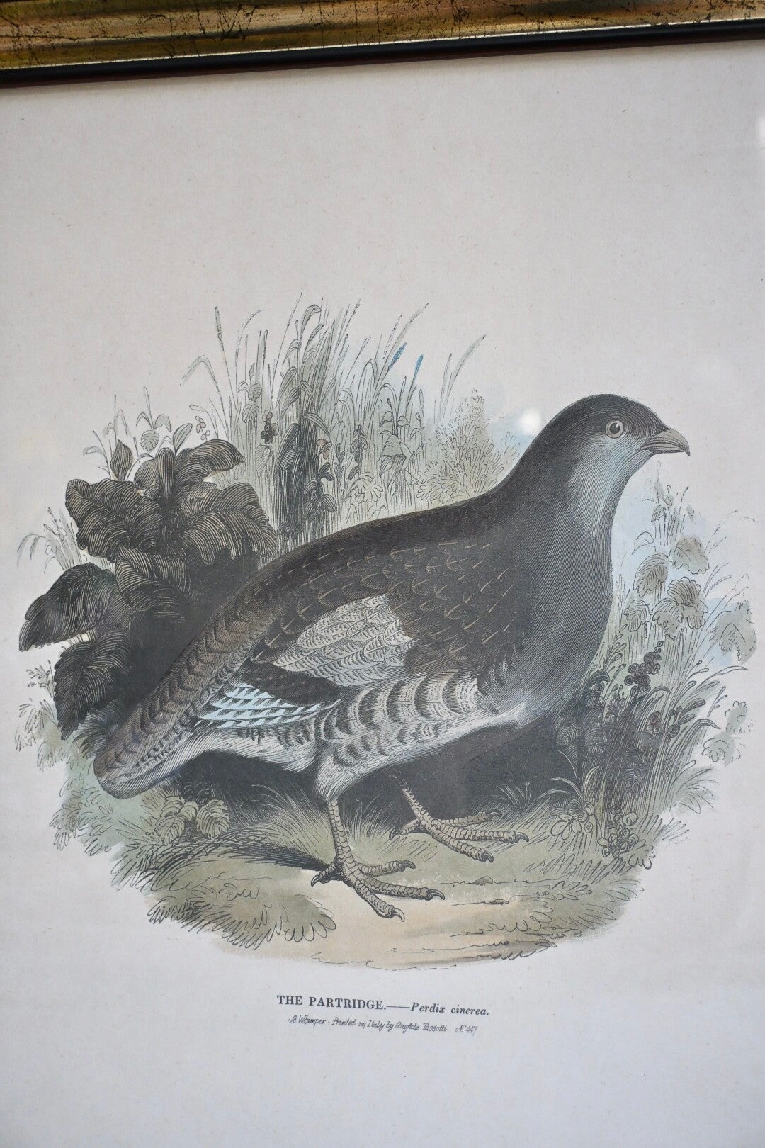 Mooie grote gedetailleerde illustratie van de patrijs een prent uit de 19e-eeuw, in een goudkleurige lijst met een bordeaux rode rand.