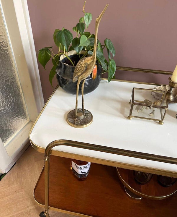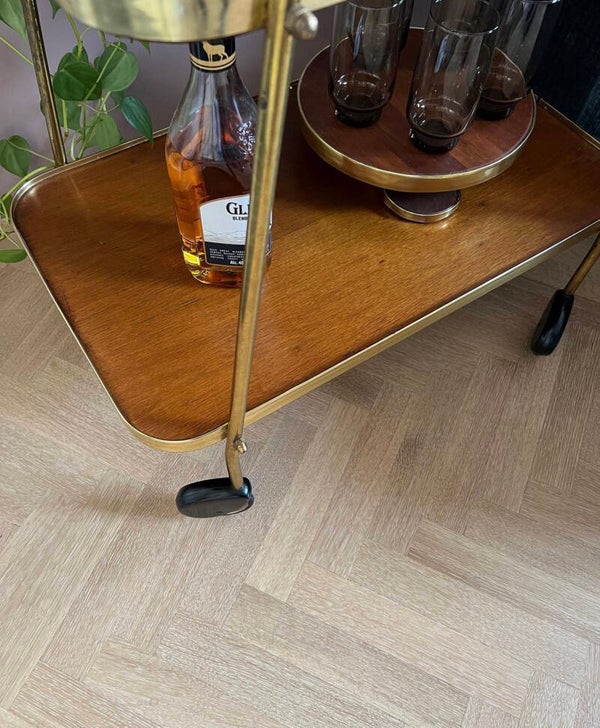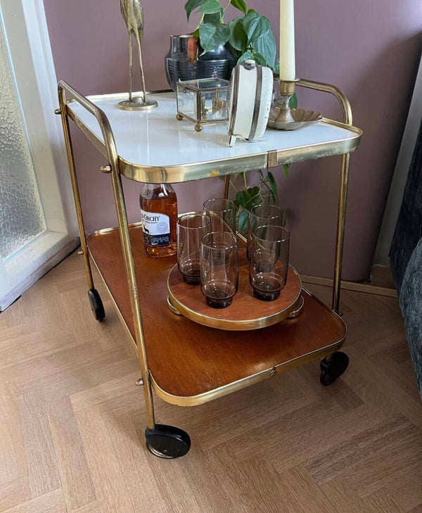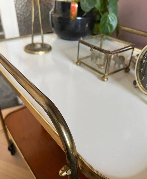 Met deze prachtige messing barcart van Ilse Möbel haal je de jaren 50 in huis. Kijk eens naar die wieltjes 😍 De bladen zijn van hout boven afgewerkt met créme kleurig formica en het onderblad lichtbruin.